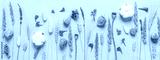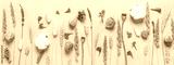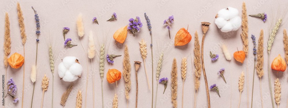 Flower composition. Dried flowers, grass and ears on beige craft paper. Beautiful floral art banner. Top view, flat lay.