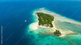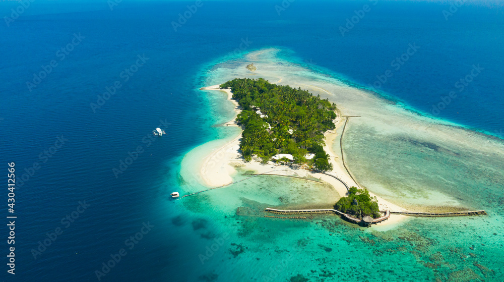 Little Liguid Island with beautiful beach, palm trees by turquoise water view from above. Little Cruz Island, Philippines, Samal.