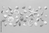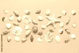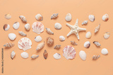 Collection of seashells and starfish on a pastel peach background. Beautiful summer beach composition. Top view, flat lay.