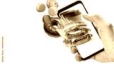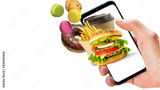 Online ordering fast food. Hand holding phone with fast food flying out of the screen