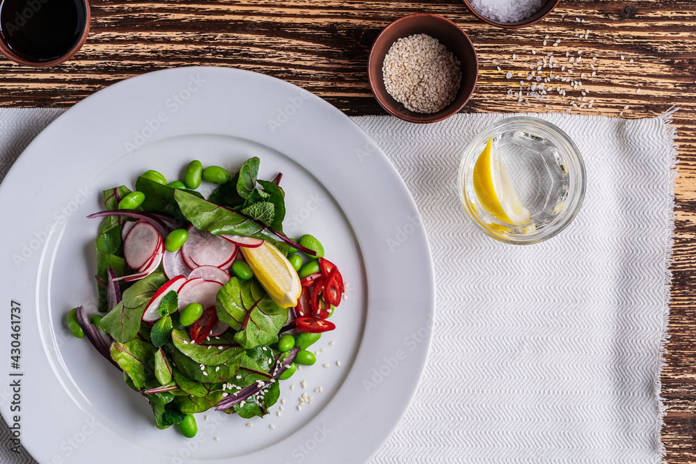 Plate of fresh spring salad on rustic wood background. Chard leaves with radish