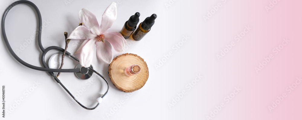 oil, tincture, medical stethoscope, creating a new medicine from plants, gifts of nature, dietary supplements, magnolia flowers, concept science, natural medicine, pharmacology, banner