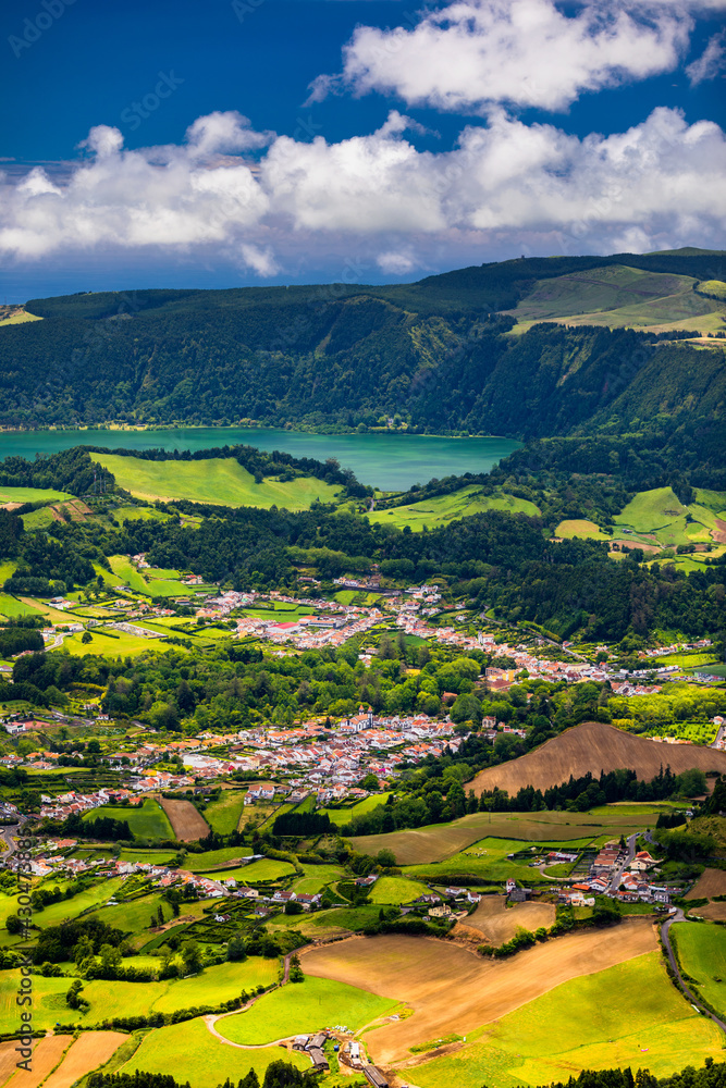 View of Furnas town and lake (Lagoa das Furnas) on Sao Miguel Island, Azores, Portugal from the Miradouro do Salto do Cavalo viewpoint. A tranquil scene of lush foliage and town in a volcanic crater