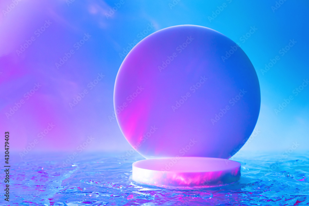 Abstract surreal scene - empty stage with cylinder podium and circle shape on holographic neon colored background. Pedestal for cosmetic, beauty product, packaging mockups display presentation