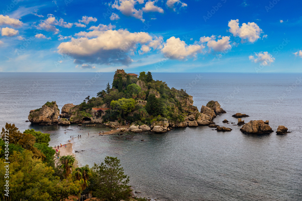 Aerial view of Isola Bella in Taormina, Sicily, Italy. Isola Bella is small island near Taormina, Sicily, Italy. Narrow path connects island to mainland Taormina beach in azure waters of Ionian Sea.