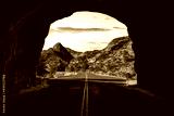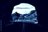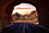Middle of the road from tunnel view of a scenic route in American Canyons Mountain Landscape. Sunset Sky Art Render. Taken in Zion National Park, Utah, United States.