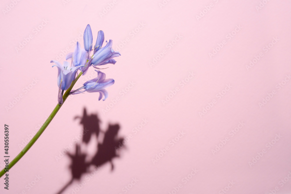 Common Bellflower, Bluebell Hyacinthoides, a ripped blue flower with a hard shadow on a pink background