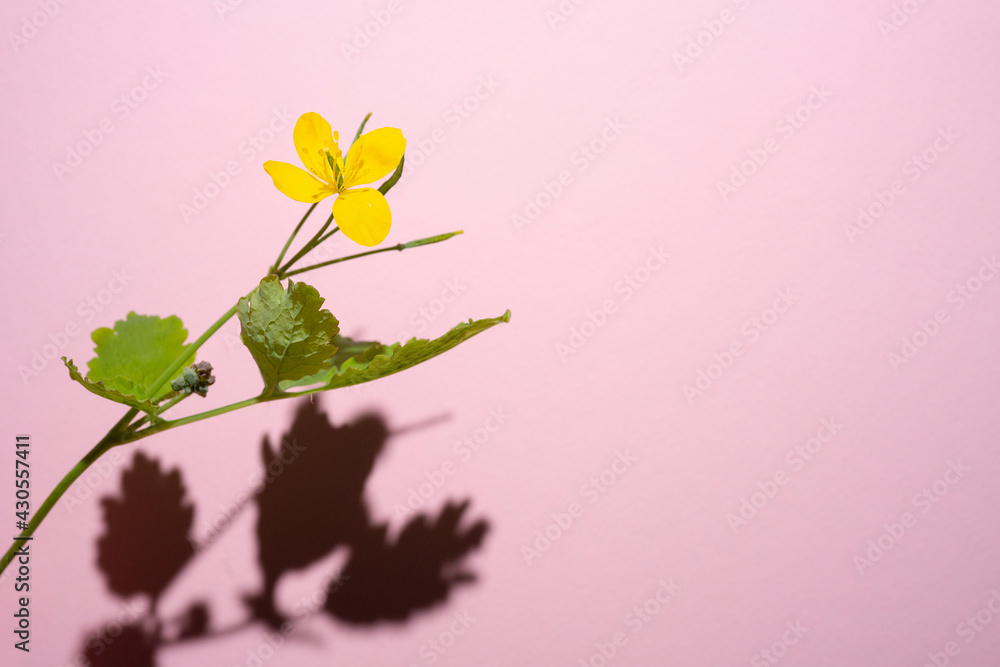 Common buttercup, Ranunculus acris, a yellow flower taken with a hard shadow against a pink background