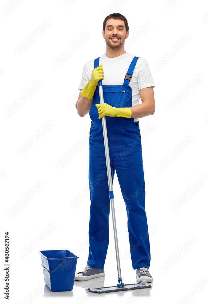 profession, service and people concept - happy smiling male worker or cleaner in overall and gloves cleaning floor with mop and bucket over white background
