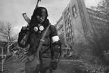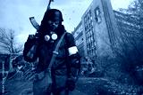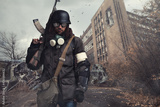 Post apocalyptic warrior in gas mask wandering through abandoned settlement.