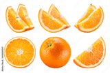 Orange isolate. Orange fruit set on white background. Whole orange fruit with slice.