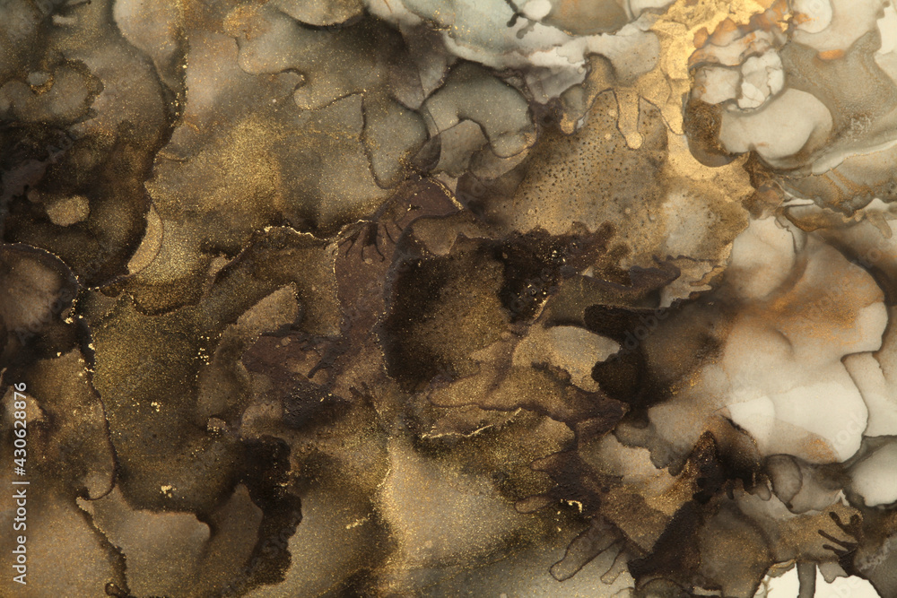 Abstract black, brown and gold glitter color horizontal background. Marble watercolor texture. Alcohol ink colors.