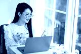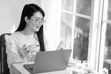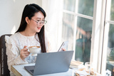 Happy of asian freelance people Businesswoman writing message on smartphone and hold a coffee cup mug casual working with laptop computer at the cafe,Business Lifestyle