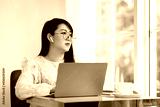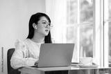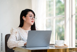 Happy of asian freelance people Businesswoman wearing wireless earphones casual working with laptop computer with a coffee cup mug,Notebook and smartphone at the cafe,Business Lifestyle communication