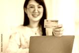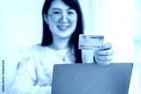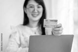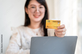 freelance people business female casual Abstract blur with focus on show holding a credit card working with laptop computer in coffee shop like the background,for online shopping and payment
