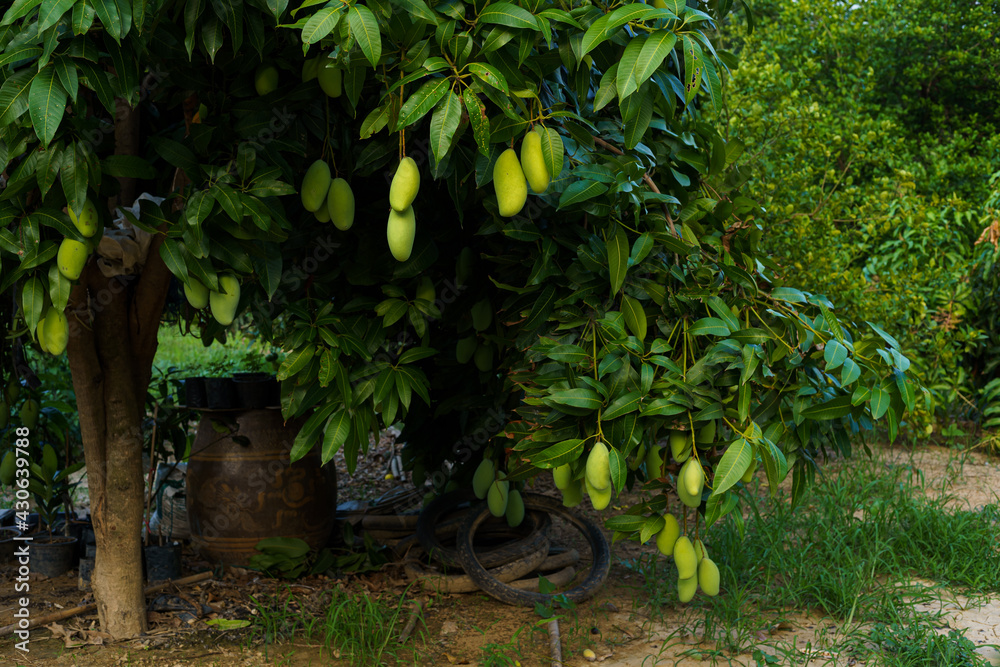 Close up of Fresh green Mangoes hanging on the mango tree in a garden farm with sunlight background harvest fruit thailand.
