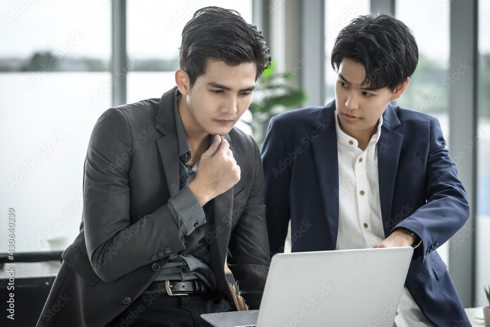 Happy Company Young Asian businessman and coaching personal secretary assistant tomboy lesbian and LGBT partners while working together with laptop computer and strategy in business in office
