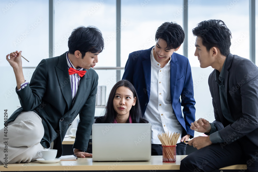 Successful Joke happy workers Group of asian business people with diverse genders (LGBT) workers with in company support in the meeting room at office