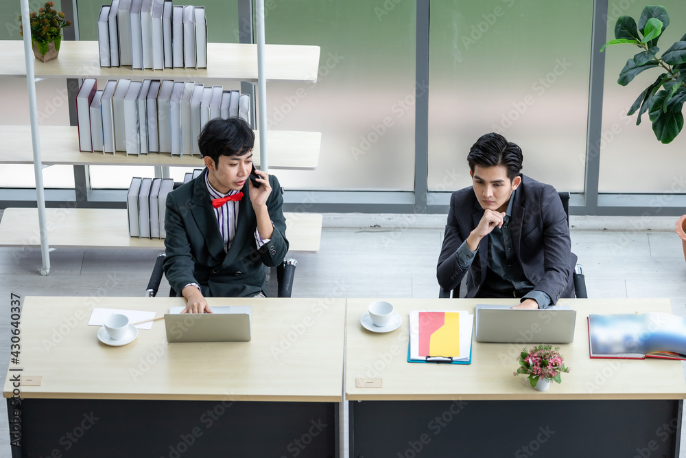 top view Homosexual Asian businessman LGBT talking with mobile phone while working at laptop computer and business people group in the meeting room at modern office