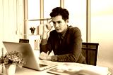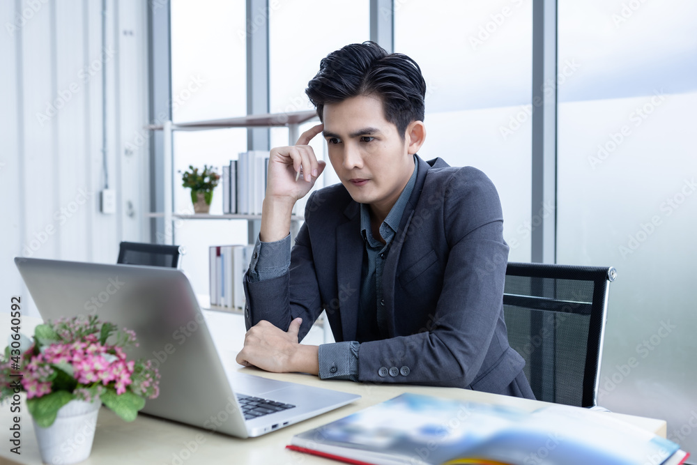 asian young businessman see a successful business plan on the laptop computer and Catalog Design on wooden table background in office,business expressed confidence embolden