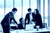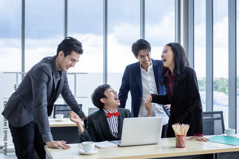 Successful happy workers Group of asian business people with diverse genders (LGBT) Clap hands and congratulate to Homosexual businessman see a successful business plan on the laptop computer in the m