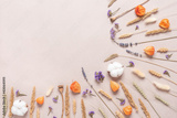 Flower composition. Dried flowers, grass and ears on beige craft paper. Beautiful floral art background. Top view, flat lay.
