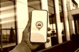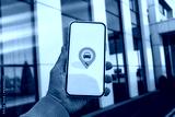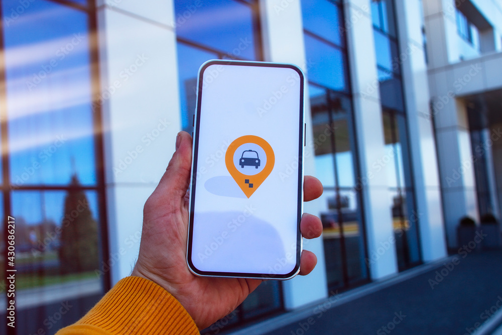 Man passenger in the parking lot holds a smartphone with a mobile application and calls a taxi online.