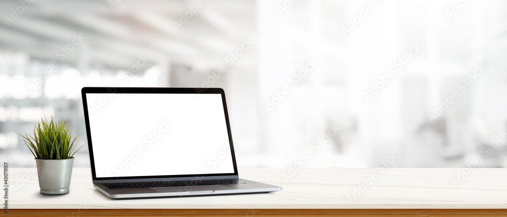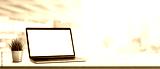 Simple workspace with laptop and plant pot on white desk in blurred background
