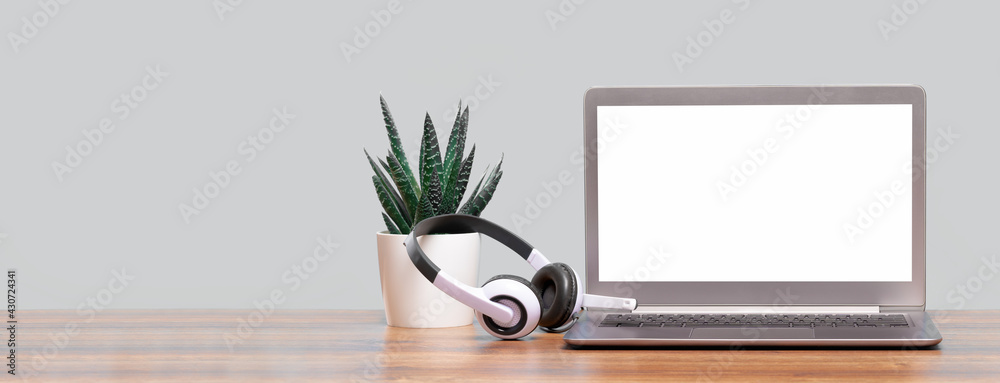 Laptop. Mockup screen and headphones on wooden desk and plain background banner. Distant learning. working from home, online courses or support minimal concept. Helpdesk or call center headset
