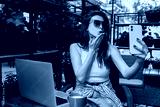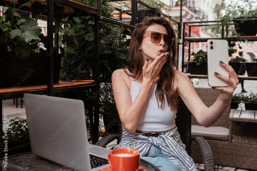 Young Cheerful Woman Using Smartphone for Video Call While Sitting in Cafe Outdoors