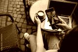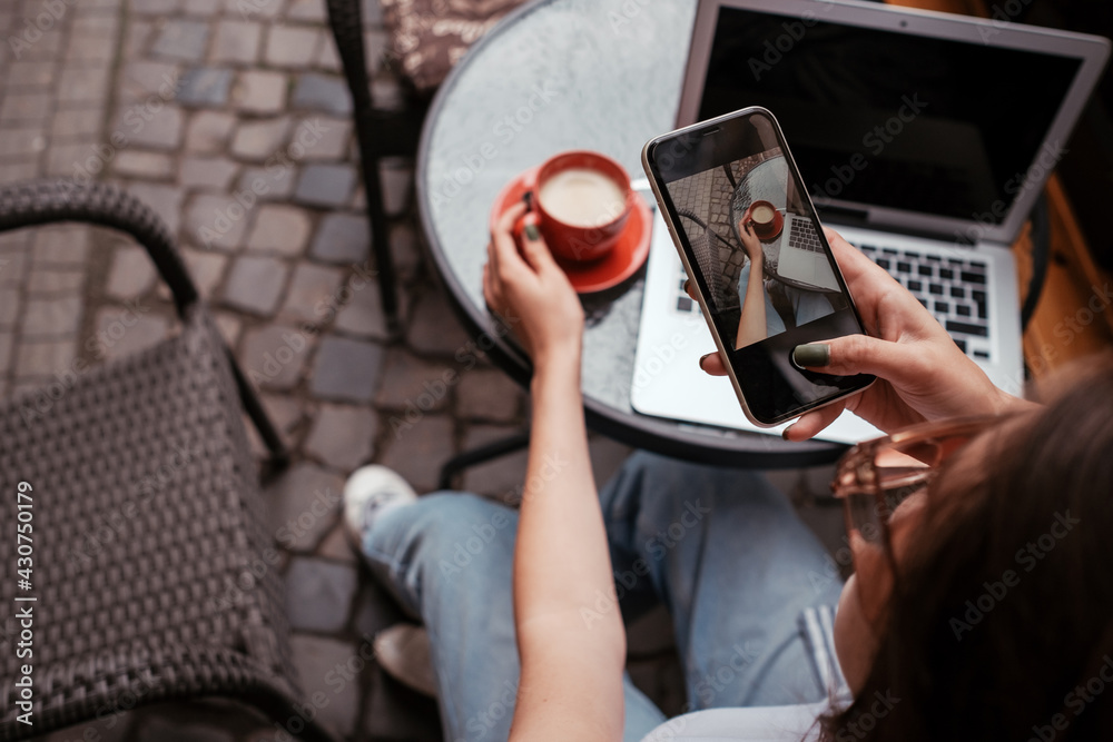 Young Brunette Woman Making Photo of Coffee on Smartphone While Sitting in Cafe Outdoors
