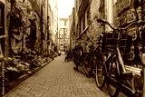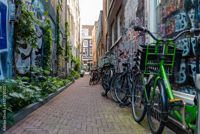 Row of bicycles parked in empty alley with graffiti on the walls
