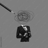 Modern design, contemporary art collage. Inspiration, idea, trendy urban magazine style. Hard thoughts in woman's head on blue background