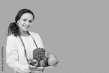Positive dietitian with fruits and vegetables for healthy eating and diet. Healthy food, dietitian consultation
