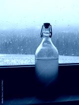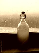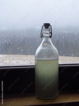 Szklana butelka z alkoholem przy oknie na parapecie, widok na zimowy pejzaż