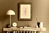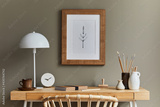 Stylish bohemian interior of home office space with wooden desk, rattan armchair, brown mock up poster frame, macrame, office supplies, lamp, decoration and elegant personal accessories in home decor.