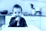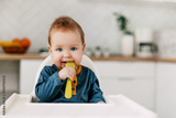 The baby is sitting in a high chair with a yellow spoon in the kitchen