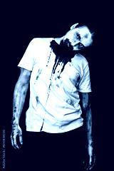 Creepy zombie man. White male wearing a white dirty shirt covered in blood. Isolated on black.