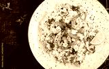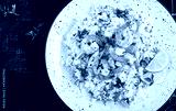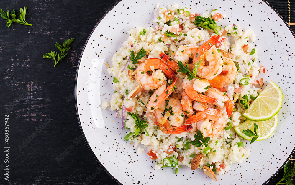 Couscous with roasted shrimps, tomatoes, red onions, almond nuts and parsley. Moroccan food with couscous and prawns. Top view, flat lay