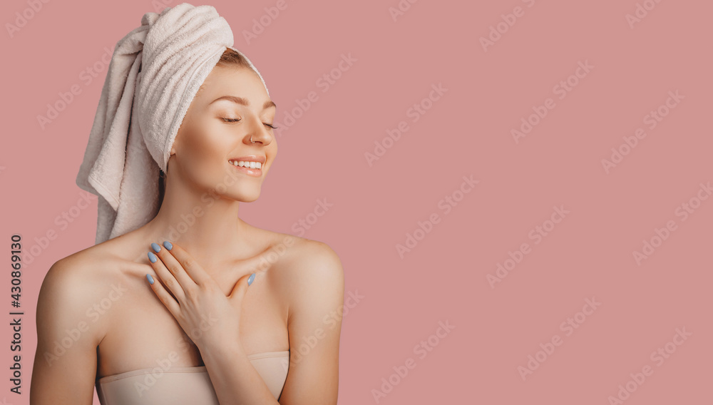 Beautiful sensual young girl with clean skin on a pink background with a mockup. Topless woman in a towel. The concept of spa treatments, natural beauty and care, youth, cream and mask, freshness