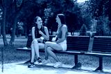 Close-up of two young girlfriends sitting on a bench in summer park chatting and having fun