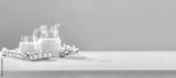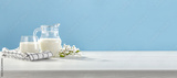 Fresh milk on white desk and blue background.