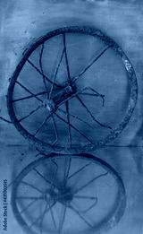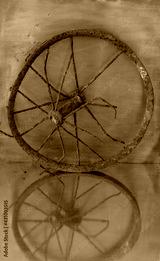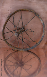 Vintage rusty wheel from a pram on a copper background. Reflection. Vertical image. Copy space.