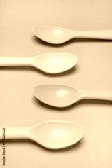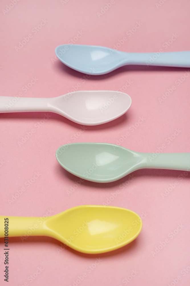 Kid spoons in different colors laid on sweet pink pastel background, a set of colorful spoons, pastel palette spoons