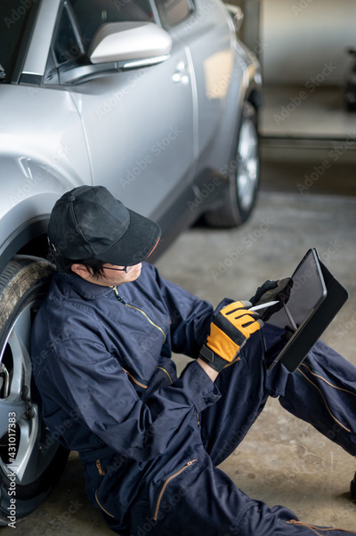 Asian auto mechanic holding digital tablet checking car wheel and tire in auto service garage. Mechanical maintenance engineer working in automotive industry. Automobile servicing and repair concept