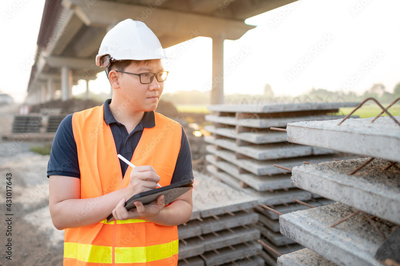 Smart Asian worker man or male civil engineer with protective safety helmet and reflective vest using digital tablet for project planning and checking material at construction site.