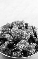 Close up picture of jumbo raisins in a bowl, selective focus, space for text.