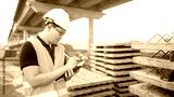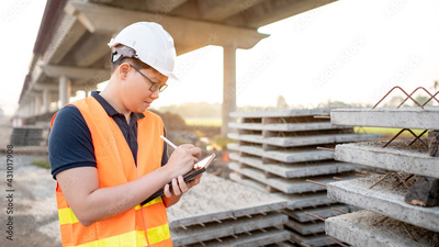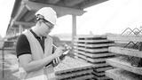 Smart Asian worker man or male civil engineer with protective safety helmet and reflective vest using digital tablet for project planning and checking material at construction site.