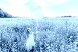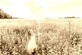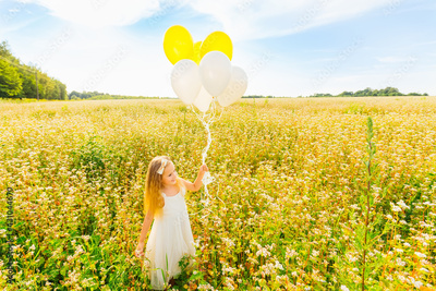 Happy child plays with white and yellow balloons outdoors. Kid having fun in a green spring field with flowers on a background of blue sky. Freedom and imagination concept.