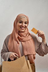 Happy young arabian woman with bags and paying card